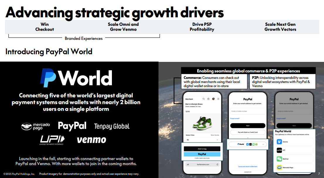 Global Wallet Partners: Announced PayPal World with Mercado Pago (LatAm), NPCI/UPI (India), Tenpay/Weixin Pay (China), bringing interoperability to ~2B wallet users.